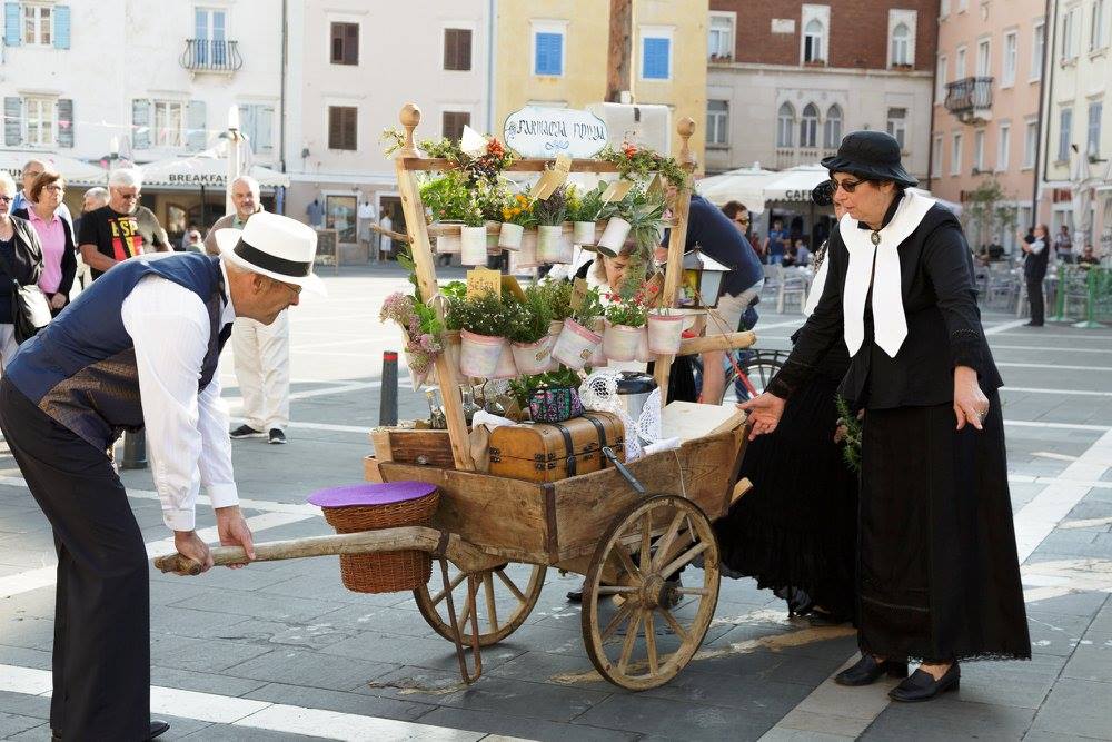 Ebbene 70 anni dopo forse qualcosa si muove: anche la maggioranza che si è compattata (o quasi) accettando al suo interno i non sloveni, forse sta capendo che la storia è cominciata prima del 1945. Ignoro volutamente e ovviamente manifestazioni come quella del 15 settembre perchè ci sono manifestazioni come le Giornate del patrimonio culturale europeo iniziate nell’ultima settimana di settembre e finite nella prima settimana di ottobre di quest’anno, che hanno evidenziato ovunque un patrimonio culturale inestimabile e profondo: Carpaccio con i suoi 500 anni a Capodistria ad opera del Museo Regionale e dei suoi esperti e a Pirano ben 17 diverse manifestazioni che hanno coinvolto un notevole numero fra istituzioni, società, appassionati e volontari. La voga in piedi, i 120 anni del monumento a G. Tartini, le imbarcazioni tradizionali del Museo, gli orti , i muretti a secco, le saline di Abbakum, i meravigliosi affreschi di Casa Tartini, ecc. è difficile nominarli tutti. Fra questi la società Anbot per il recupero delle tradizioni locali, ha organizzato un evento originale: “Andiamo in piazza”, tour guidato di piazza in piazza, partendo dalla Punta fino in Borgo, in piazzetta S. Rocco. Nelle piazzette e piazze oltre a fare la storia degli edifici importanti e significativi i membri della società, circa una trentina, tutti in costume, hanno raccontato, drammatizzandoli, aneddoti e fatti del passato: la vendita dell’acqua e l’antica farmacia Fonda in piazza I maggio, Domenico Tintoretto – il quadro vivente , Anna Monaro, la donna luminosa di Pirano in Ghetto, la vendita del pesce come stabilito negli antichi statuti comunali in Piazza delle Erbe, le misure di lunghezza sui pili del 1466 in piazza Tartini, le “venderigole” piranesi e savrine di piazza S. Rocco.